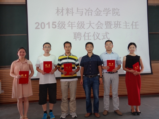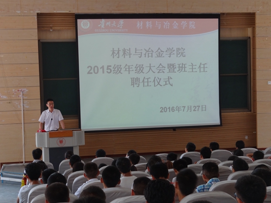 贵大新闻网讯 (材料与冶金学院新闻中心 付芸卓 吴颖 摄影报道) 为帮助2015级学生认清形势,尽快熟悉学院情况,进一步明确学习目标,做好学习生活的计划安排。7月27日下午,材料与冶金学院在新校区圆形报告厅举行了“2015级年级大会暨班主任聘任仪式”。学院党委书记胡环宇、党委副书记张瑞良、副院长熊玉竹、陈朝轶,教学科研科科长王丽远,学生科先桁、黄河林老师,以及各班班主任参加了此次大会。会议由党委副书记张瑞良主持,材料与冶金学院2015级全体同学参会。