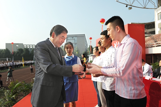 校党委书记陈坚向新生代表赠送了“品德之笔”、“才能之笔”,意在鼓励同学们能珍惜读书机会,成为一名德才兼备的人。随后,主席台就座领导和专家为新生代表佩戴校徽。