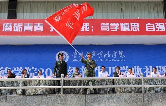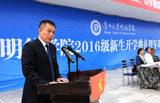 总会计师谢田凯宣读成立贵州大学明德学院2016级学生军训团文件。