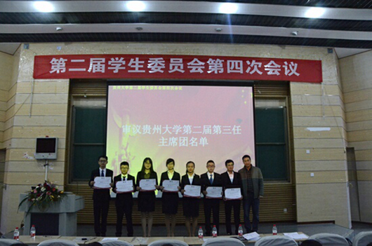 会议审议并通过了《贵州大学学生会第二届第四任主席团选举办法》。学生会主席王蕊作2015——2016年度工作报告,她表示,在党委的领导和团委的指导下,校学生会一年来努力找准方向,积极为广大学生开展服务活动,向学校相关部门反映的一些问题也得到了及时解决,受到了同学们的肯定。她希望新一届学生会能更加精诚合作,深入开展服务工作,切实发挥学生会的主体作用