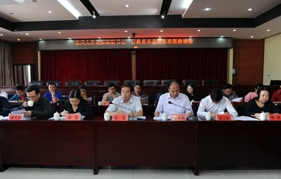 在贞丰县会议中心,校党委书记陈坚一行与贞丰县主要负责同志开展座谈。贞丰县党委书记陈湘飚,县委常委、县委组织部部长陈磊,县委常委、副县长褚辉,县委常委、副县长蔡从军,副县长王仕祥及贞丰县有关部门负责人参加座谈会。贞丰县委组织部部长陈磊介绍了贞丰县及我校帮扶的9个村基本情况,校党委副书记杨伟民介绍了贵州大学对口帮扶贞丰县精准扶贫工作开展情况,校党委副书记杨未代表贵州大学向“大手拉小手”对口帮扶小学捐赠了96台电脑及桌椅。座谈会还听取了我校派驻贞丰县全体驻村干部的工作汇报。
