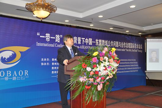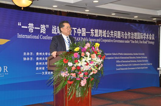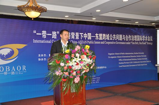 贵大新闻网讯(文/图 刘文科)10月29日,由我校公共管理学院主办的“一带一路”倡议背景下中国—东盟跨域公共问题与合作治理国际学术会议在贵阳市花溪迎宾馆举行。前中国常驻联合国教科文组织代表、大使尤少忠,中国工程院院士、我校副校长宋宝安,校纪委书记汪海波,贵州省教育厅国际处处长糜丹出席开幕式。来自泰国、越南、柬埔寨、马来西亚、缅甸、菲律宾、印度尼西亚、加拿大、韩国、中国等国家院校和研究机构的嘉宾参会。汪海波主持开幕式。