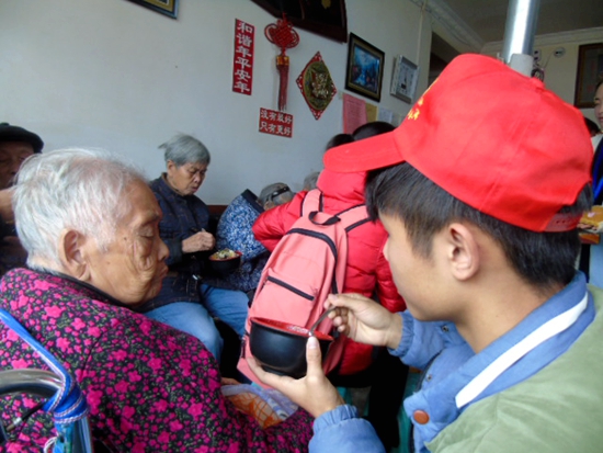 上午,志愿者们到达敬老院并对老人们进行了慰问。针对老人们不同的情况,志愿者们通过不同的方式为老人们送去了关心与善意。有的志愿者陪老人们聊家常,倾听老人们缅怀自己的青春岁月;有的志愿者陪老人们打牌、下棋,引得老人们开怀大笑;面对许多由于脑萎缩而神志不清的老人,志愿者们也热情地与其交流,为其敲背、捶腿、揉肩。有时候老人讲话的声音很轻,而且带有浓重的口音,但志愿者们没有感到不耐烦,反而更加耐心地和老人进行交流。中午吃饭时,志愿者们给部分行动不便的老人们喂饭。