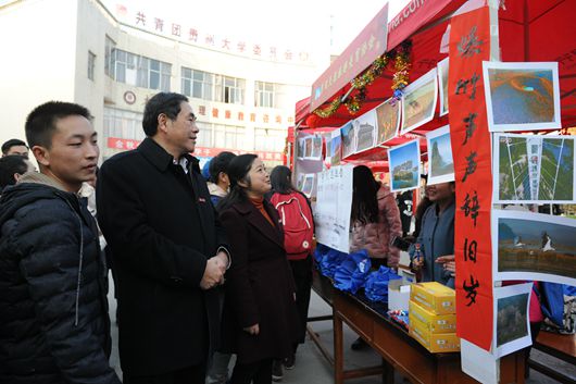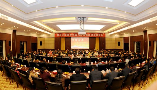 晚上19:30,辞旧迎新话发展暨师生代表与校领导面对面座谈会在新校区崇义楼报告厅召开。校领导陈坚、郑强、王红蕾、骆长江、杨未、金道超、向淑文、李军旗、张覃、谢田凯,青年教师代表、学生代表参加座谈会。会上,校长郑强致辞,他表示:“省委省政府十分重视贵州大学的建设,贵州大学近几年取得了很大的发展,办学规模和实力、科研成果、学校影响力等实现了巨大提升,希望全校师生卯足一股劲,为贵州大学更加美好的未来而奋斗。”青年教师们就科研平台建设、住房保障等提出了建议和意见,校领导以及相关部门都一一做了回复。