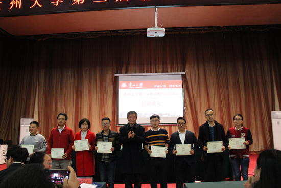 结业典礼在教师工作处精心制作的培训视频中拉开序幕,视频从开班仪式、专家风采、教学活动、素质拓展四个模块展示了培训期间专家和学员们的风采。从小组讨论中推选出来的吴卿、柳进军、胡琦、周鹏、杨健晟、陈昌盛、谢兰等分别代表8个小组作培训总结汇报,大家都表示非常感谢学校提供的宝贵学习机会,给青年教师在贵大的工作和生活指明了方向,让大家受益匪浅。电气工程学院的周鹏表示此次培训极大提升了新教师的职业技能,增进了职业素养和职业道德,提高了教师职业能力。通过5天的封闭式培训,相信友谊的种子已经播下,以后在贵大的工作和生活将不再孤单和寂寞,团队的精彩生活才刚刚开始。音乐学院的柳进军给大家展示了其本人作曲的音乐作品,作品优美动听,感情真挚,余音袅袅,获得了在场老师的热烈掌声与一致好评。