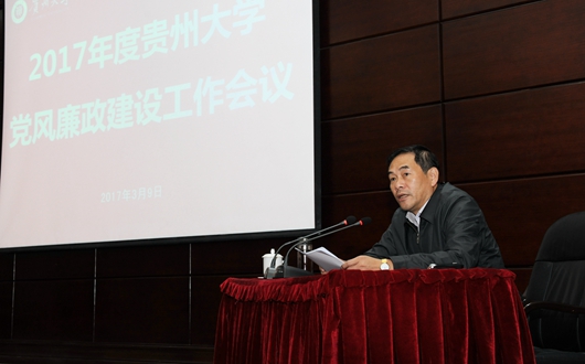 贵州大学新闻网(文字 尹梓熹 摄影 陈恒)3月9日下午,2017年度贵州大学党风廉政建设工作会议在行政楼报告厅召开。校领导陈坚、宋宝安、金道超、汪海波、向淑文、李军旗、谢田凯出席会议。校党委副书记杨伟民主持会议。
