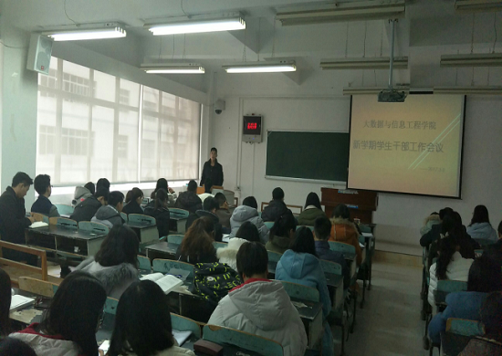 贵大新闻网讯(大数据与信息工程学院 宣传部 何娇娇 报道|摄影 黄志鹏)3月8日中午,大数据与信息工程学院2017年春季学期第一次学生干部例会在北校区博学楼420D教室召开,学院党委副书记王高军、学生科科长郭嫚以及学生科辅导员郑大伟,学院团委学生会副部级及以上学生干部、各本科生党支部学生副书记、勤工助学负责人,各班班长、团支书、学习委员以及心理委员参加会议。会议由郭嫚主持。