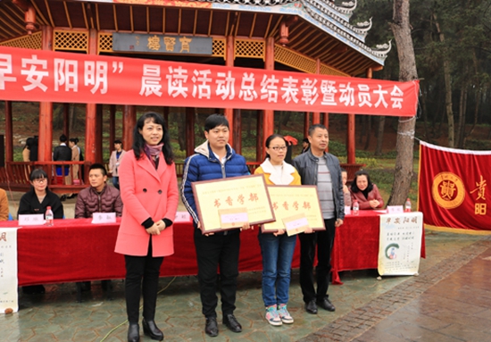 贵大新闻网讯(记者团 姚瑶 龙金梅 实习记者 张绍香 报道|摄影 张运凤 刘胜难)3月15日下午阳明学院在新校区育贤楼广场举行了“早安阳明”晨读活动总结表彰暨动员大会。旨在通过表彰在上学期晨读中表现突出的学部、班级和个人,进一步推进“早安阳明”晨读活动,加强学风、院风建设。学生工作部部长郭林桦、阳明学院院长张寒松、党委书记余颖及相关领导和老师参加了动员大会。