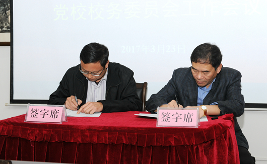 陈坚代表校党委与机械工程学院、动物科学学院、法学院等基层党委代表签订了2017年党建责任书;为哲学与社会发展学院、数学与统计学院、林学院等基层党委代表颁发网络培训证书。