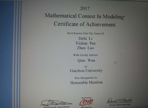 贵大新闻网讯(数学与统计学院供稿)4月8日,2017年美国大学生数学建模竞赛和交叉学科建模竞赛成绩揭晓,我校学生获得一项国际一等奖(Meritorious Winner)和一项国际二等奖(Honorable Mention)。