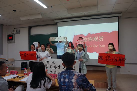 三个班级展示结束后进入互动环节,全体人员观看了关于习近平总书记下乡插队的纪录片《初心·梁家河篇》,意在学习习近平总书记艰苦奋斗、心系人民的精神,同时进行猜红歌游戏。