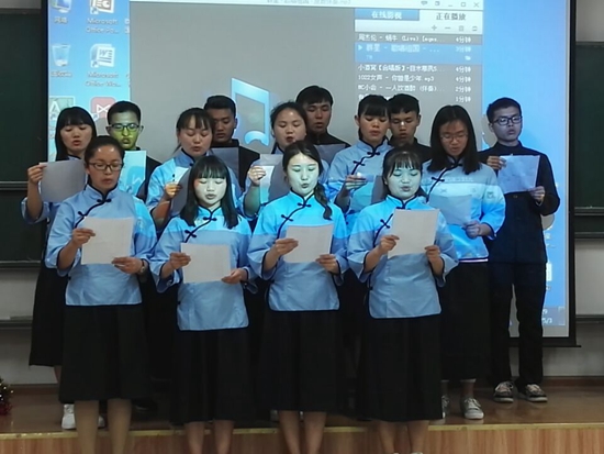 文艺表演正式开始,同学们穿着民国时期的学生制服,整齐走上讲台,合唱一首《歌唱祖国》,用响亮的歌声,表达着对祖国的热爱之情。由15级女同学创作的小品《大话西湖》的表演中,搞怪的剧情和同学们滑稽的表演让现场爆笑不断。老师们也积极参与其中,陈孝玉龙老师深情地演唱了一首《冰雨》,博得了热烈的掌声。在进行“你比我猜”的游戏环节中,老师和同学们的纷纷报名,两人一组,一人背对幻灯片,一人看了幻灯片上的描述词语,有趣的比赛让现场爆笑不断。演出的最后由学院的入党积极分子朗诵爱国诗《祖国啊,我亲爱的祖国》,庄重严肃的朗诵声回荡着整个教室。