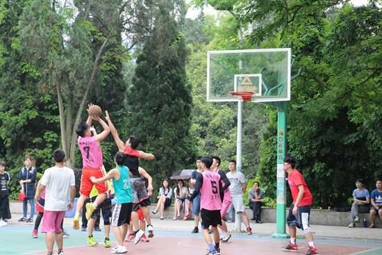 贵大新闻网讯(经济学院团委学生会新闻部 刘明辉 摄影报道)为提高学院学子体育精神,加强身体素质,经济学院于5月11日中午在北校区博学楼前举办“经院杯”篮球友谊赛决赛。经济141班与经济151班争夺冠、亚军,金融141班与金融152班争夺三、四名。两场比赛同时进行。学院党委副书记杨海、学生科老师李云前来观看比赛。
