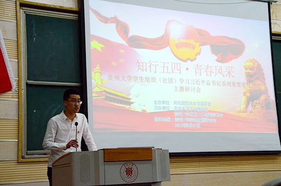 贵大新闻网讯(记者团 唐嵩涛 报道| 摄影 孙玉慧) 为学生们更好的践行社会主义核心价值观,弘扬社会主义正能量,由共青团贵州大学委员会主办,贵州大学学习理论社、贵州大学红色文化学习研究会承办的“知行五四,青春风采”主题研讨会在我校西校区西楼105学术报告厅举行。参会人员有校团委组织部副部长兼社联指导老师廖银、校学生会主席左亚东、学习理论社社长钟大勇以及贵州大学各社团团支书、学生代表。