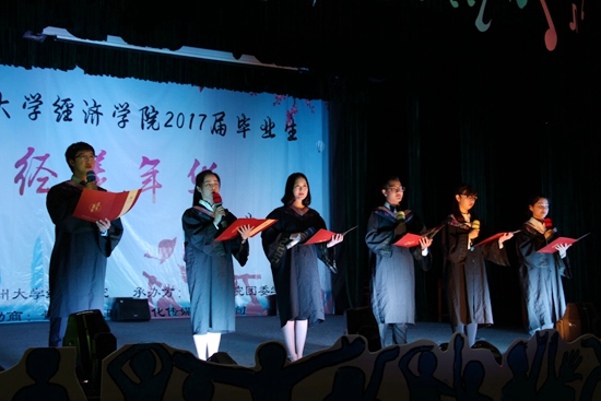 在晚会上,Loading乐队的《再见青春》、《飞》燃爆全场,拉开晚会帷幕。书记黄莉教授与院长王秀峰教授寄语毕业生:“希望同学们能在外生根,发芽,成长,结果。经济学院永远是你们的家,随时欢迎你们常回家看看。”激情而奔放的拉丁舞《你在终点等我》讲述了一个为爱付出的动人爱情故事。张超先生创作的《云上贵州》带领同学们领略令人神往的贵州故事,向大家展示在大数据产业助推下日新月异的新贵州。嘉宾周融儿带来《天赐礼物》制造出一个温情的画面,表达出生活的平淡真实。《We are ready》的走秀将晚会拉向高潮。随着时间的流逝,晚会在毕业生代表饱含深情的朗诵中缓缓落下帷幕。