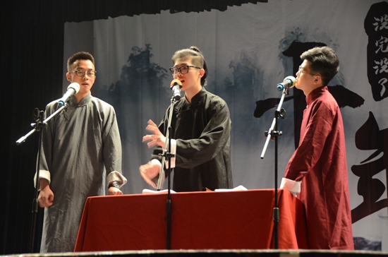 男女相声演员合作双口相声《太阳真缺德》,谈语言的规律,在表达汉字和外文的区别时,演员现场设计、演绎小剧场,生动逗趣的语言让观众身临其境。群口相声《八扇屏》围绕文言文、对联、古人的传奇故事展开,在令人捧腹的相声中向观众传达了文言文的内涵、中国传统文化的精髓,传达了相声文化的核心。2013级社员马越、赵晋带来的相声《双学叫卖》,用不同地域卖菜的吆喝声和幽默的肢体语言逗乐全场。