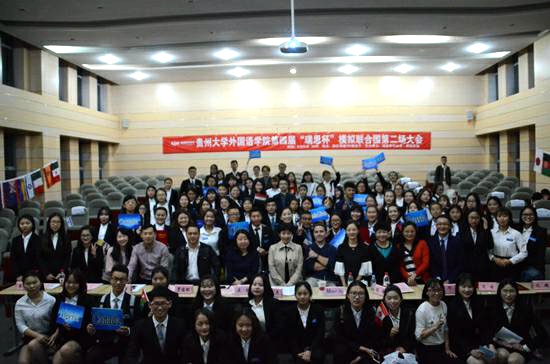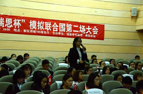贵大新闻网讯(记者团 杨缘 报道|摄影 黄明慧)5月25日晚,我校外国语学院第四届“瑞思杯”模拟联合国大会第二场在我校新校区西楼105教室举行,本次大会议题为“反恐怖主义”。 我校国际交流与合作处副处长吴静,外国语学院院长周杰,外国语学院党委副书记罗俊松,瑞思学科英语•贵阳区域投资人、校长陈静,瑞思学科英语•贵阳区域校长谷建军出席大会,外国语学院副教授邓耘、芮婷、沈麟,外国语学院团委负责人韦伊、外教Mark、助教李倩曲参加大会。