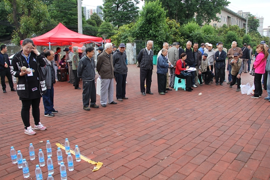 闭眼摸数字由裁判员计分,累计得分最高者获胜,蒙着眼罩退休教职工们小心翼翼地向前走,凭着记忆将手指停留在数值大的数字上,但是一下偏左或偏右的方向让现场观众不时大笑。套圈投准处选手们手拿套圈,盯准水瓶并投出,虽然一些圈并未投中,但是人群中不断传来鼓励的声音,老人们热情高涨,乐在其中。
