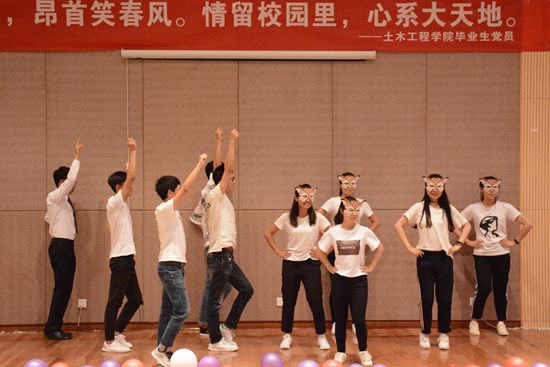 在欢送会上,各个党支部带来的节目表演让现场气氛高涨。建环给排党支部带来舞蹈《barlala》赢得观众们的欢呼,一首由建工党支部唱的《今天你要嫁给我》别出心裁,欢送会在交通基岩党支部带来的诗朗诵《写在离别的渡口》中结束。