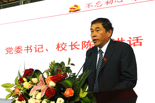 校党委书记、校长陈坚讲话。他回顾了我们党的发展历程。他说,我们党由小到大、由弱变强的成长历程,是党直面杀戮、前仆后继的曲折历程,更是党团结带领全国人民同心同德、发奋图强的奋斗历程。