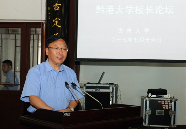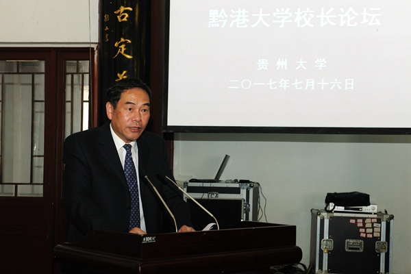 贵大新闻网讯(文字 杨汝才/ 摄影 陈恒 唐国飞)7月16日下午,黔港大学校长论坛在我校中国文化书院举行。来自香港中文大学、香港科技大学、香港城市大学等12所香港高校的校长齐聚贵大,与贵州高校校长共议黔港教育合作发展。中央政府驻香港联络办公室教科部部长李鲁,教育部港澳台事务办公室常务副主任赵灵山,贵州省教育厅厅长王凤友,贵州大学党委书记、校长陈坚出席论坛。论坛由中国工程院院士、贵州大学副校长宋宝安主持。
