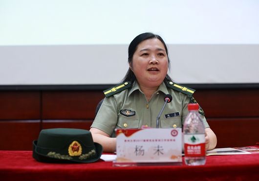 杨未讲话。她指出,开展研究生军事训练十分必要,这不仅是强化研究生素质的有效手段,也是我校思想政治工作中的一张靓丽名片。她要求,各研究生培养单位、各相关职能部门要对此次军训给予高度重视;军训师、团部各部门要通力合作,认真开展各项军事活动;各级研究生干部要积极配合,在历练中成长。她希望2017级研究生们能够严格要求自己,塑造良好的精神风貌,顺利完成军事训练任务,为自己未来的学研之路开个好头。