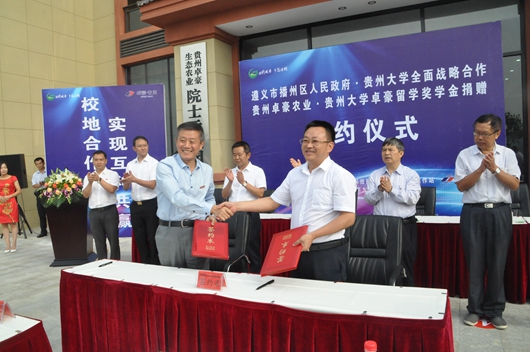 贵大新闻网讯(见习记者 李柏锋)9月13日上午, 遵义市播州区人民政府与贵州大学全面战略合作协议签署暨“贵州大学卓豪留学生奖学金”基金捐赠仪式在播州区石板镇举行。双方将在现代高效农业人才基地建设、人才培养、品种选育等方面深入交流合作,加快科技转化成果,促进地方经济转型发展。