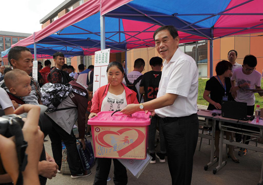 校党委书记、校长陈坚强为新生赠送爱心大礼包