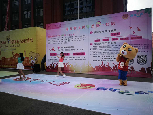 在迎新现场,“易班”工作站醒目的招新展板与海报吸引了众多前来报名的大一新生,工作站的同学为新生们送上了精心制作的小礼品,比如印有我校标识的小扇子等,作为送给加入“易班”工作站同学的第一份礼物。新同学们还争先和萌萌的“易小熊”合影。