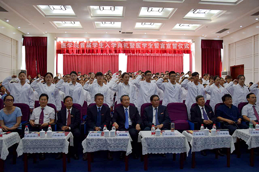 宣誓仪式在激昂的音乐中举行,与会领导为医学院首届学生代表赠送白大褂,省人民医院党委书记、医学院副院长张湘燕领誓,全体医学生进行了庄严、神圣的誓言宣誓仪式。