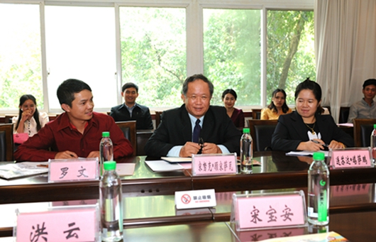 国际交流与合作处处长洪云为来访客人介绍了我校留学生的奖学金种类及老挝学生获奖情况。对于宋努克•顾宋萨瓦所关注的老挝留学生的学习表现也做了真实、详尽的汇报。