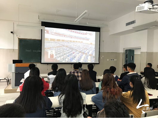 贵州青年在屏幕前收看开幕会,热血沸腾。