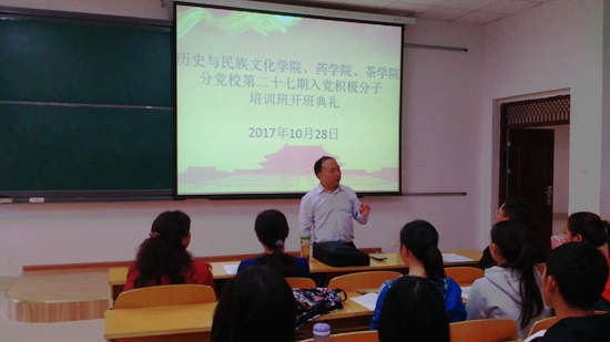 贵大新闻网讯(茶学院 供稿)10月28日上午,我校历史与民族文化学院、药学院、茶学院分党校第二十七期入党积极分子培训班开班典礼在西校区明俊楼113D教室举行。历史与民族文化学院党委书记李开学和党委副书记雷方俊、药学院党委副书记张豫芳、茶学院党委副书记(主持工作)罗聃宁出席典礼,44名学员全体参加,典礼由茶学院老师盛律平主持。