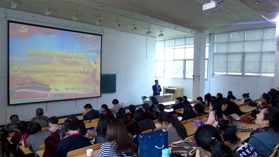 贵大新闻网讯(外国语学院 陈恒娇 报道|摄影 杨莉萍)10月27日中午,外国语学院在北校区外语楼外阶二多媒体教室召开全院教职工大会,组织学习党的十九大精神。全院领导班子和在职在岗的150多位教职工参加学习。大会由院党委书记白震主持和主讲。