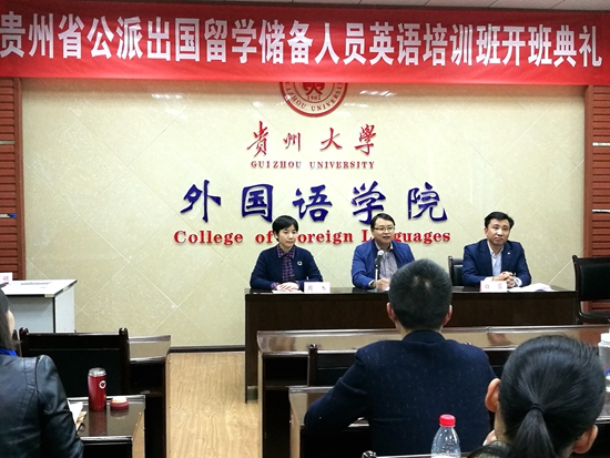 贵大新闻网讯(外国语学院 陈恒娇 报道|摄影 杨莉萍)2017年11月6日下午,贵州省公派出国留学储备人员英语培训班开班仪式在我校外国语学院201会议室举行。贵州省教育厅政策法规处副处长(主持工作)、国际交流与合作处临时负责人刘万千,外国语学院党委书记白震,院长周杰参加开班仪式。