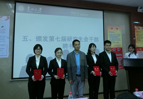 第七届研究生会副主席向月敏代表第七届研究生会向大会作了《外国语学院第七届研究生委员会工作报告》,对过去一年研究生会的工作进行了总结并对下一届研究生会提出了努力方向。报告结束之后,张小彬和白震分别为第七届研究生会干部和第七届研究生会优秀研究生干部颁发聘书和荣誉证书。