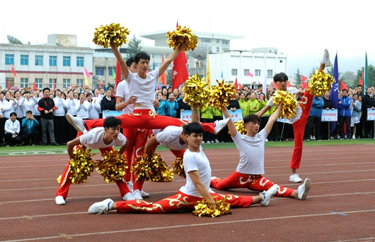 入场式最后,在贵州省第三届大学生运动会健美比赛中获得三金两银好成绩的贵大代表队登台演出。健美操队员伴着节奏舞动,活力溢满全场,队员手执的金色彩球在这层林尽染的时节显得熠熠生辉。