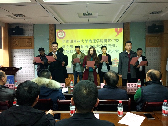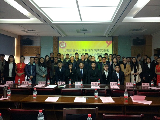 贵大新闻网讯(物理学院 彭卫国 报道|摄影 龙柳)11月24日上午,物理学院在我校北校区博学楼313报告厅召开研究生委员会第一次团员代表大会暨第二次研究生代表大会。我校党委研究生工作部部长罗勇作为特邀嘉宾参加大会,物理学院党委书记王更生、院长江阳、副院长唐延林、党委副书记陆定波、院长助理、系主任、科室负责人、辅导员参加了会议。大会还特别邀请了校研究生会、校研究生团委、贵研新闻社、三助中心、溪山艺术团、研习社、各兄弟学院代表参加本次会议。