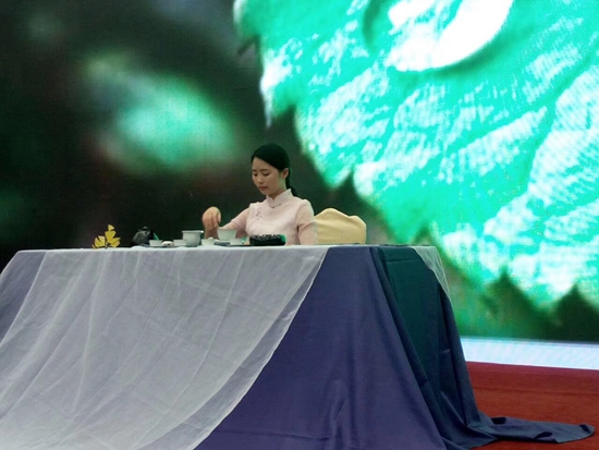 茶学151班的李彩云同学的茶艺表演《雨巷》,引人入胜,引领各位嘉宾徜徉在贵州蒙蒙细雨的古巷,只为寻找一杯茶香。茶学161班胡芝、祝枭、张娜、杨云表演的《侗乡情》,从一曲纯正侗族情歌开始,浓浓的油茶香,随着山泉水的注入和不断的熬煮,浸满了整个大厅。喝到油茶的领导和嘉宾们也用家乡侗话与同学们交流茶文化。