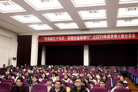 贵大新闻讯(记者团 赵昱 实习记者 陈婷婷 报道|摄影 杨林)12月5日晚,由校团委主办、学生社团联合会承办的“青春礼赞十九大,实践公益砥砺行”之CCTV年度慈善人物——余太湖分享会在北校区行政楼一号报告厅举行。中华宋庆龄基金疑难病专家委员会贵州分会会长周国强,贵州省同心光彩事业基金会“快乐助学金”项目发起人俞建辉,以及校团委组织部副部长、社团联合会指导老师廖银莅临大会。第四届CCTV慈善人物、最美“讨书哥”余太湖担任分享会主讲。