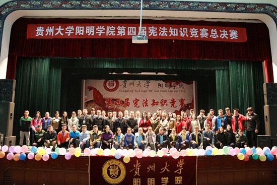 贵大新闻网讯(记者团 周萍 实习记者 李细报道|摄影 吴扬)12月5日晚,我校阳明学院第四届宪法知识竞赛总决赛在北校区大礼堂举办。受邀参加本次比赛的评委有我校阳明学院党委书记余颖,党委副书记李耘、谢佳,法学院教授孙志煜,贵州师范大学法学院教授毛永俊。本次比赛共有约700名阳明学子到场观看。