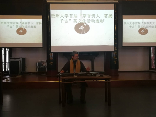 杨未讲话。她说,“茶香贵大·茗扬千古”活动不仅丰富了学校的校园文化,也让师生感受到浓烈的茶文化气息,为师生们提供了一道传统文化的大餐。她希望学生们多参与这样富有特色的活动,去学习、了解我国的传统文化,汲取传统文化的滋养,从中体味生活的哲理,人生的真谛。