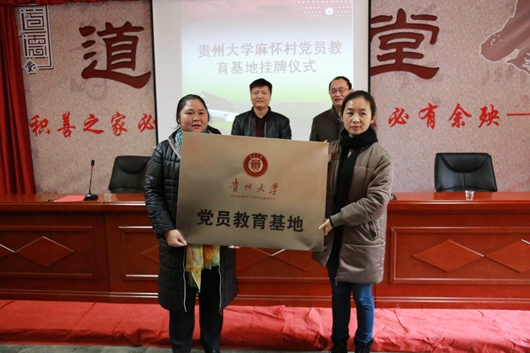 为进一步拓展我校与麻怀村共谋发展的平台和渠道,双方同意建立贵州大学麻怀村党员教育基地、贵州大学新农村发展研究院麻怀村综合示范基地、贵州大学“三下乡”社会实践基地,并举行了挂牌仪式。