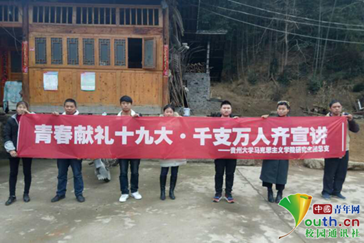 据悉,“宣传党的十九大 青年学子在路上”系列活动由贵州大学团委牵头。贵大青年学子们通过进寨宣传宣讲、走村采访调研、支部共建分享等老百姓喜闻乐见的新颖宣传形式,将党的十九大精神在黔中大地落地生根。家在辽宁、天津、湖南等地的外省同学也在家乡开展了内容丰富的十九大精神宣讲活动。