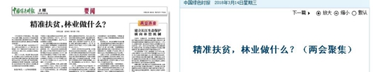 党的十八大以来,林业部门推出生态保护、生态建设、生态产业等组合拳,突出抓好生态护林员选聘、退耕还林、建立脱贫攻坚造林专业合作社、木本油料、林下经济等举措,在精准扶贫中取得了积极进展。全国两会期间,生态扶贫成为代表、委员关心的话题,林业在脱贫攻坚中的优势和潜力被看好。