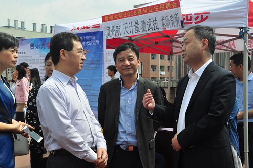 王华平一行参观了贵州大学当日举行的校园招聘会,招生就业处负责人简要介绍了招生处的基本招聘工作情况和工作安排。王华平就在场学生就业情况、招聘单位的招聘情况、毕业生就业的具体流程等做详细了解。他强调,生产建设一线需要人才,要想做好加快发展工作,须得重视人才,做好人才基础工作。