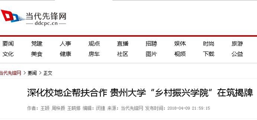会上,贵州大学乡村振兴学院正式揭牌。贵州大学将进一步整合学校资源,通过搭建乡村振兴学院继续教育与服务平台,校内设立专业分院,校外设立帮扶县乡“新时代‘三农’讲习所”等联动措施,依托省农委信息进村入户建设工程等项目,利用互联网+和大数据技术创新人才培养模式,健全乡村人才培训体系和管理服务机制,着力培养“爱‘三农’、有技术、懂经营”的乡士人才,为贵州脱贫攻坚、全面乡村振兴提供人才支持服务。