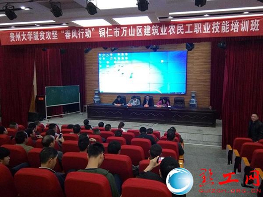 4月26日,贵大脱贫攻坚“春风行动”铜仁万山区建筑业农民工职业技能培训开班典礼在铜仁八中举行。“这次免费培训,在于让参训学员了解和掌握建筑施工工艺、技能技巧、工程质量管理标准等,为贫困地区农民从事建筑业工作奠定基础,并让他们有收益、有想法,迈开脱贫致富的新脚步。”贵大继续教育学院副书记丁韬说。