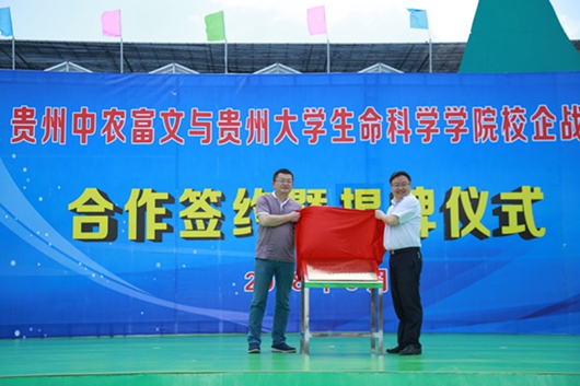 当天,贵州大学生命科学院院长喻理飞与修文县统战部副部长赵俊共同为贵州大学教学实习实训基地揭牌。