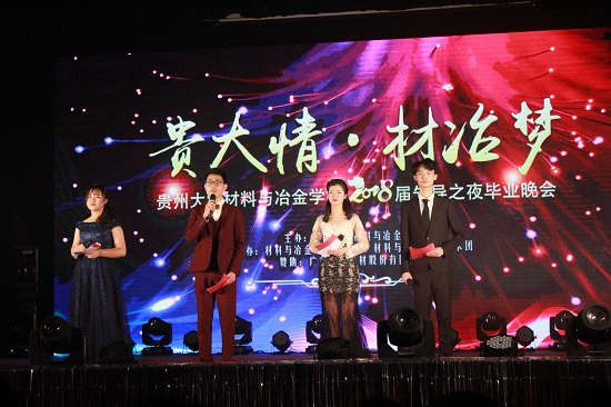 贵大新闻网讯(记者团 赵荣莉 报道|摄影 吴庆花)5月18日晚,由材料与冶金学院主办,材料与冶金学院学生会、艺术团承办的“贵大情·材冶梦”先导之夜毕业晚会于北校区大礼堂举行。材料与冶金学院党委书记胡环宇、院长刘其斌、副院长熊玉竹等,学生工作处副处长于松,广东先导公司稀材股份有限公司相关负责人出席晚会。